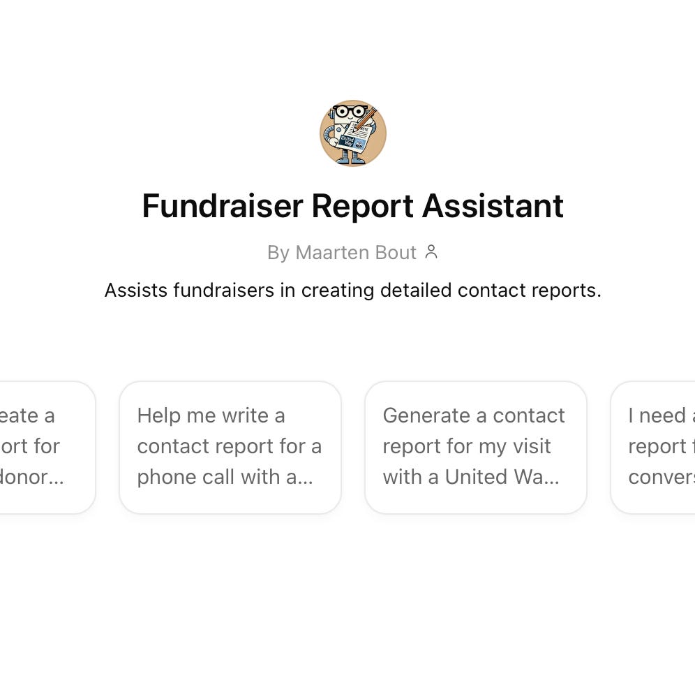 To address both problems of quality of contact reports and that fundraisers could really use an easier way to do contact reports, a while back I experimented with creating a GPT that would allow for easy generation of high-quality contact reports. From that same study, we were able to reverse engineer a template contact report that included all particular aspects of what we found the good contact reports all had in them. So, I trained a GPT on those things we found associated with meaningful contact reports that were associated with desirable giving outcomes.